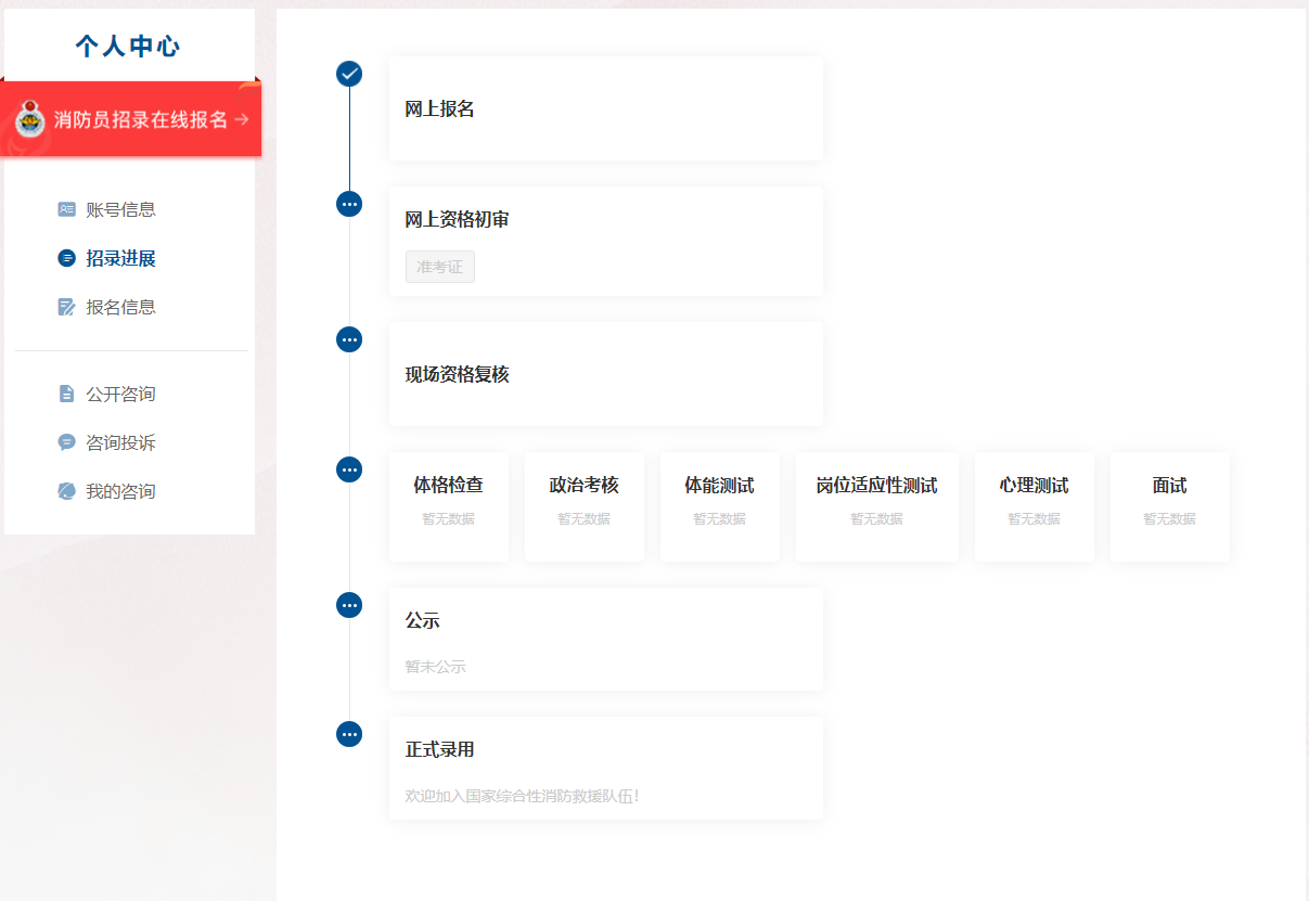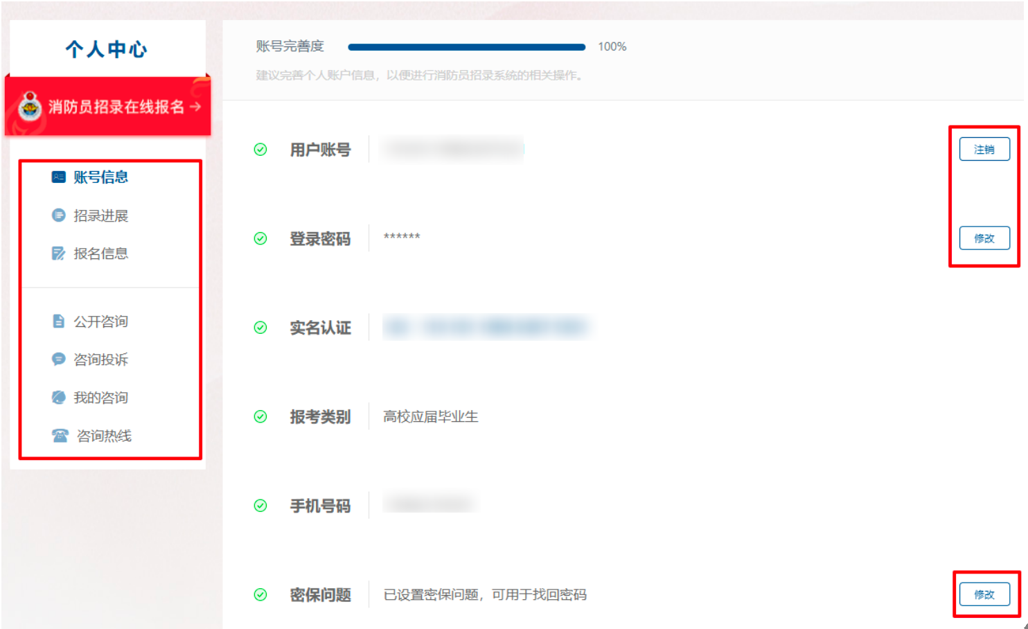 在个人中心可维护账号信息、查看招录进展、编辑报名信息和提交咨询投诉,报名信息提交前,招录对象如有发现注册信息中身份证号及报考类别填写有误的,可点击用户账号后的【注销】按钮自行注销当前账号后重新注册;报名信息提交后,招录对象不可自行注销;报名信息提交前,招录对象如有发现姓名或身份证正反面照片有误的,可点击实名认证后的【修改】按钮进行修改;报名信息提交后,如需修改姓名或身份证正反面照片需点击实名认证后的【申请修改】按钮进行申请,管理员审批通过后方可修改。