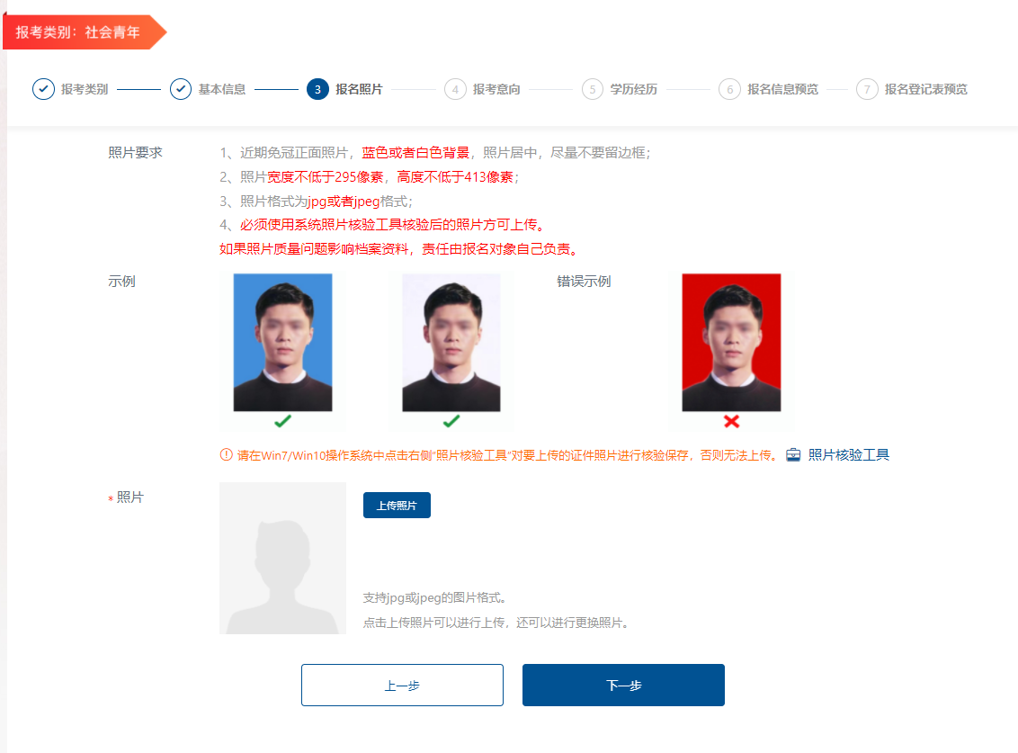招录对象需上传本人证件照片,为本人近期1寸正面免冠彩色证件照片(须为蓝色或白单色背景,295×413像素,JPG或JPEG格式),照片需经系统工具处理符合要求后方可上传。