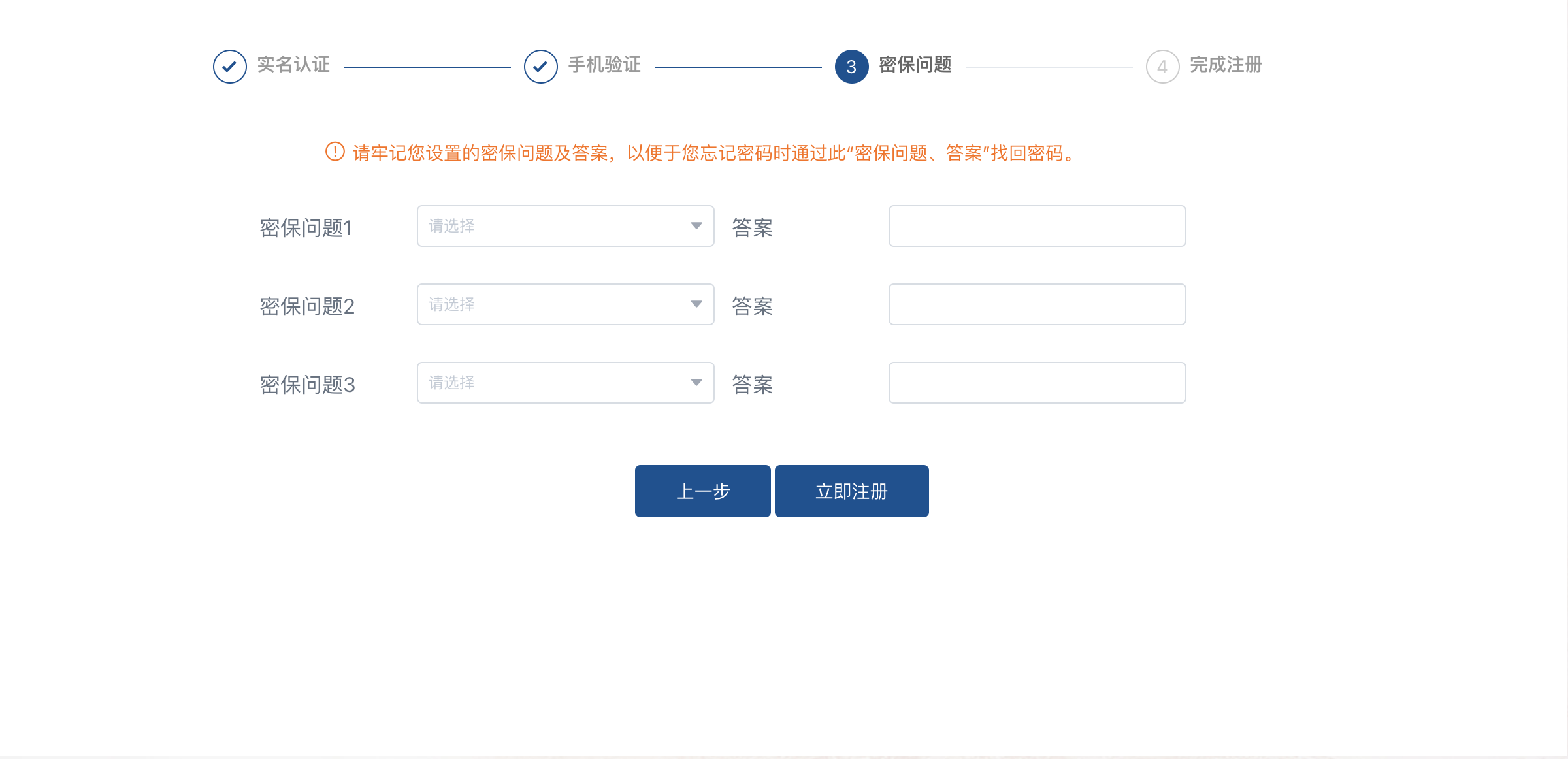 手机验证通过后,为防止招录对象忘记密码,设置密保问题设置环节,请牢记设置的密保问题及答案,以便在忘记密码时,通过“密保问题”方式找回密码。