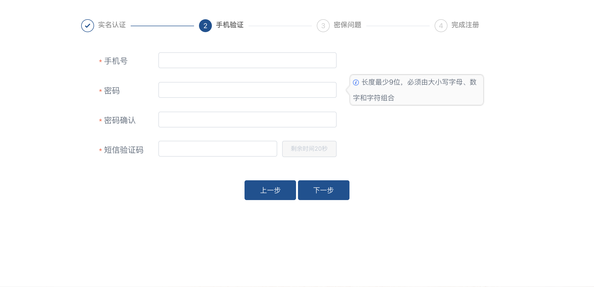 实名认证通过后,需进行手机验证,手机号将作为报名及考核期间接收系统短信的唯一渠道,请输入招录对象本人可正常使用的手机号。密码长度最少9位,必须包括大小写字母、数字和字符的组合。